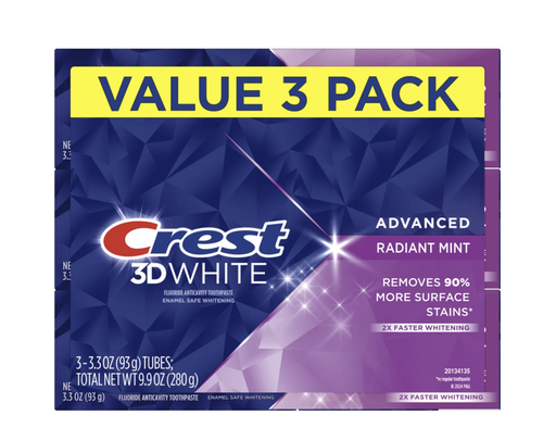 Product details Crest 3D White Advanced Teeth Whitening Toothpaste, Radiant Mint, 3.3 oz, 3 pack. Brighten your smile with Crest 3D White Advanced...